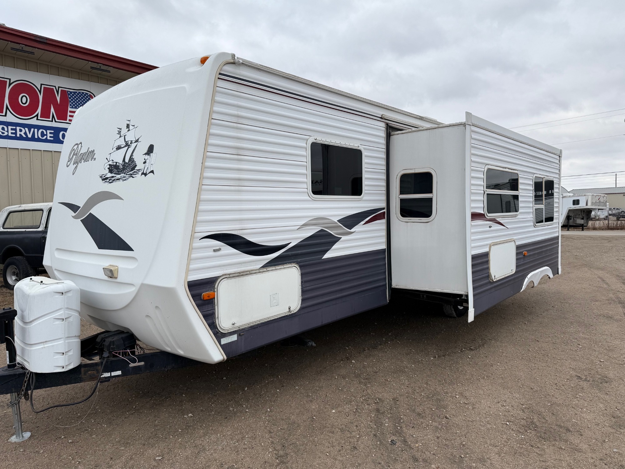 2005 Pilgrim 282RBSS travel trailer. Front queen bedroom, walk around bed. Central living/kitchen, Spacious rear bathroom. Everything is in good working condition. Unloaded weight 6,060lbs and overall length is 30ft. Priced at $8,950.00 C1020626 Call Tom -or- Rick at the office (402)-564-4111