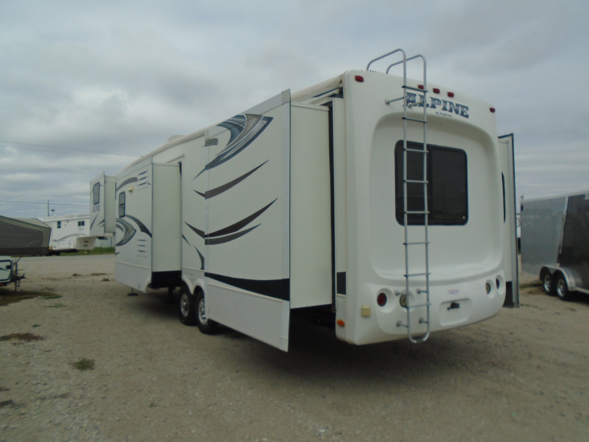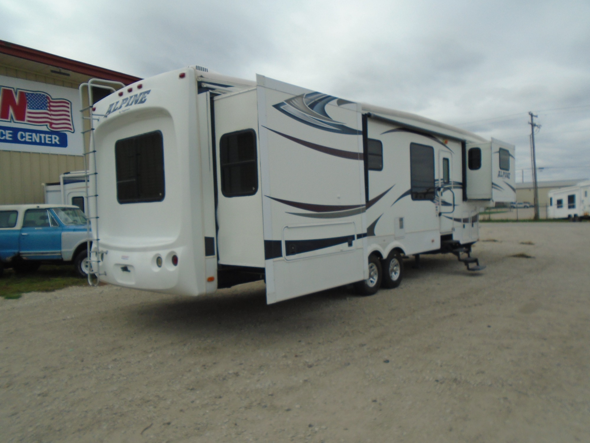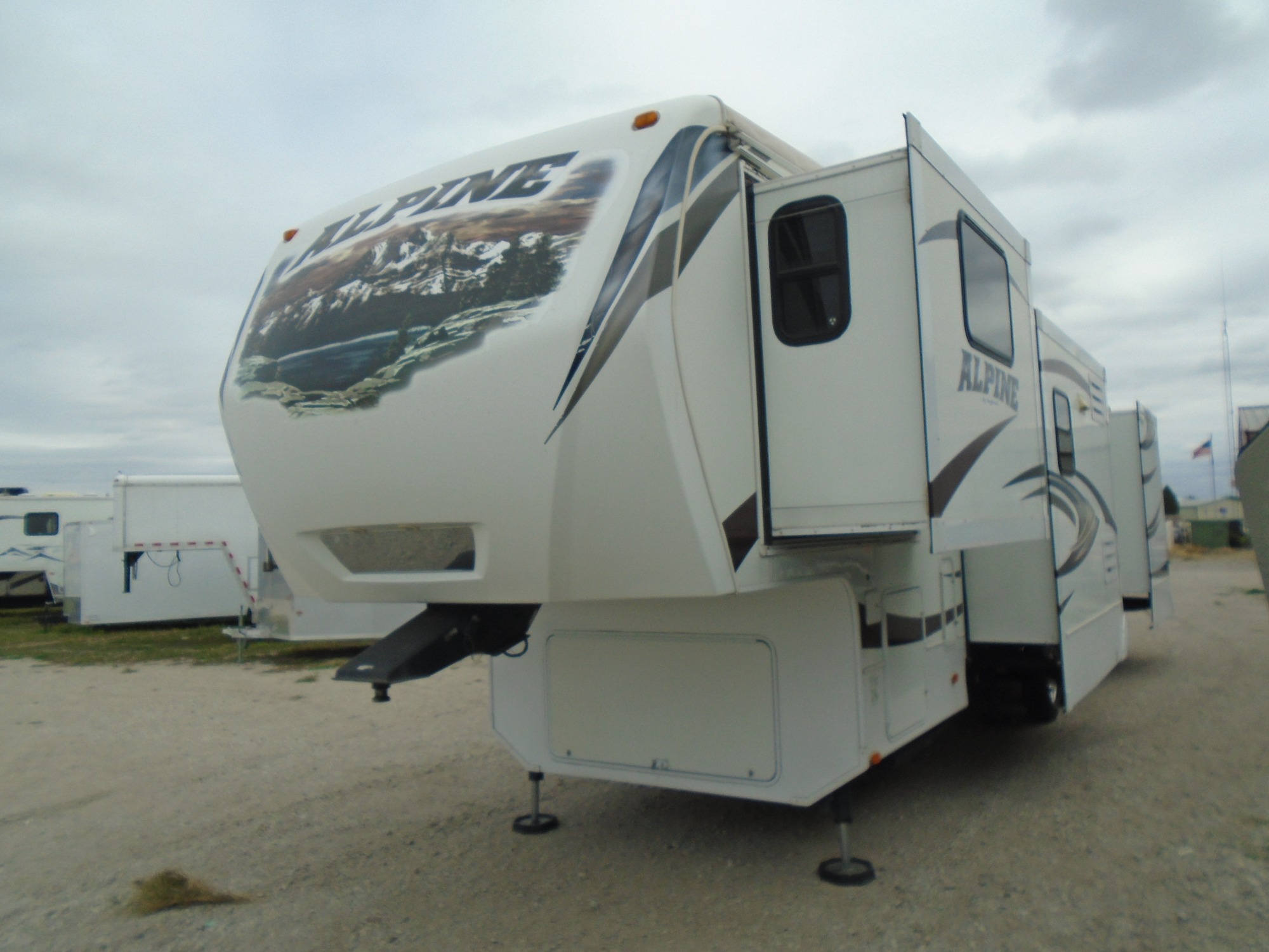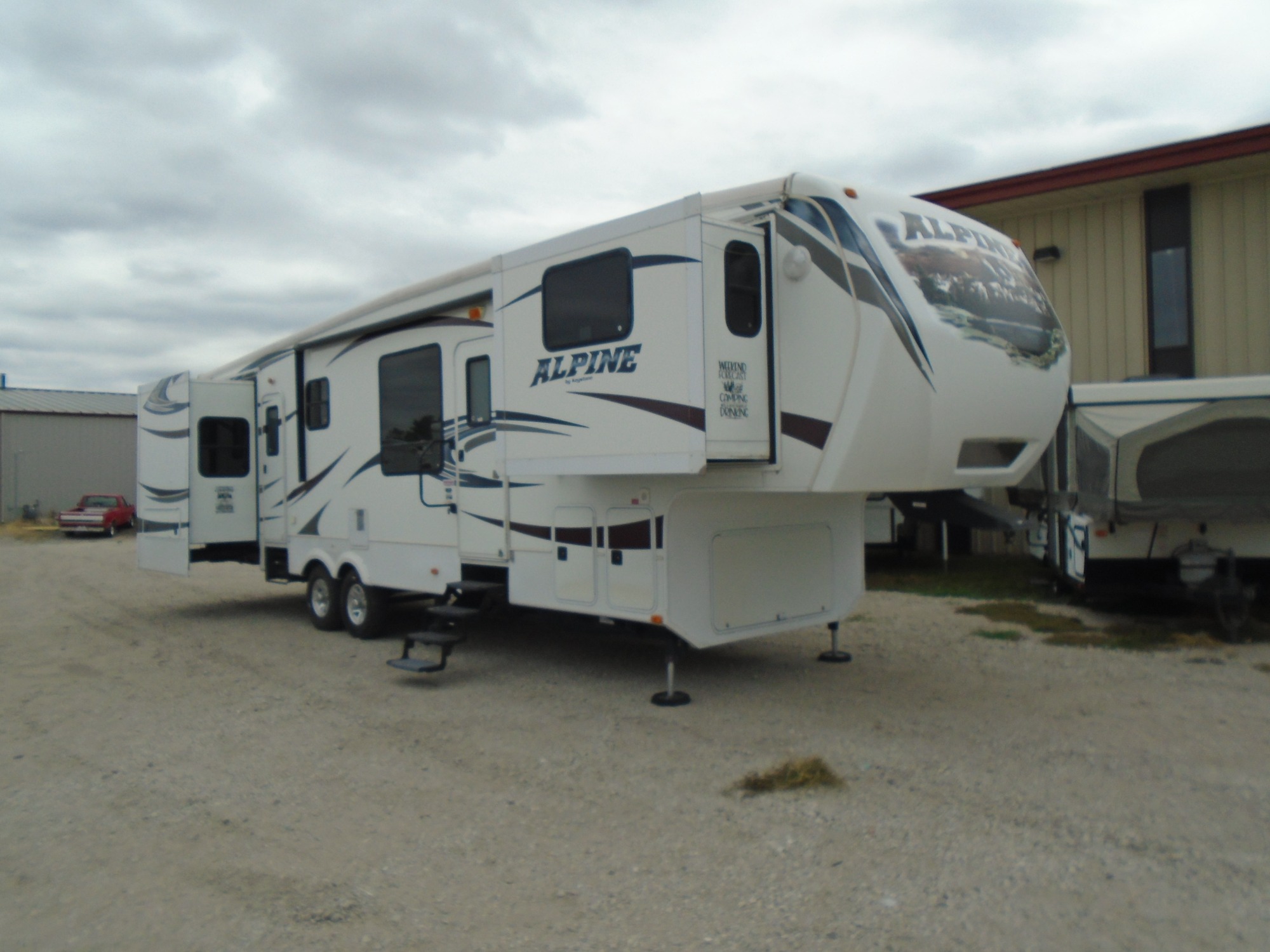 2013 Keystone Alpine 5th wheel M#3495FL. Front living with opposing slide outs, Central kitchen with a slide out, Rear king master bedroom with opposing slide out. 5 slide outs total! Amazing floor plan. Amazing floor plan!! Everything is in good working condition! Unloaded weight is 12,290lbs. with a overall length of 39ft 5in. Priced at $29,950.00 S092322 Call Tom -or- Rick at the office (402)-564-4111.
